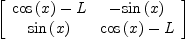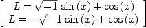 {\left[{L ={{{\sqrt{- 1}}\ {\sin \left({x}\right)}}+{\cos \left({x}\right)}}}, \:{L ={-{{\sqrt{- 1}}\ {\sin \left({x}\right)}}+{\cos \left({x}\right)}}}\right]}= \
