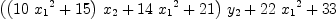 \label{eq6}{{\left({{\left({{10}\ {{x_{1}}^{2}}}+{15}\right)}\ {x_{2}}}+{{14}\ {{x_{1}}^{2}}}+{21}\right)}\ {y_{2}}}+{{22}\ {{x_{1}}^{2}}}+{33}(6)