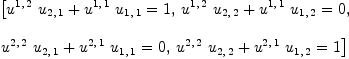 \left[{{{{u^{2, \: 1}}\ {u_{1, \: 2}}}+{{u^{1, \: 1}}\ {u_{1, \: 1}}}}= 1}, \:{{{{u^{2, \: 1}}\ {u_{2, \: 2}}}+{{u^{1, \: 1}}\ {u_{2, \: 1}}}}= 0}, \: \right.